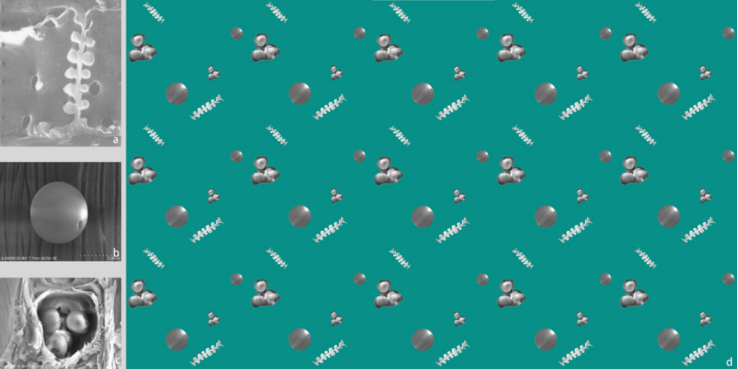 下面即为散点式木美图案,其原始素材分别为松木径切面上射线细胞端壁单纹孔对(a),龙眼木径切面上导管腔中的淀粉球(b)和龙眼木弦切面上射线细胞腔内淀粉粒(c)。从原始素材图像中抠取木美元素,采用散点式图案创作方法进行构图,即可获得散点式四方连续木美图案(d)。