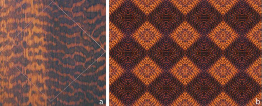下面即为对称式木美图案,其原始素材(a)为蛇纹木心材板面上的宏观花纹,从原始素材图像中截取方框部分作为木美元素,采用对称式图案创作方法进行构图,即可获得对称式四方连续木美图案(b)。