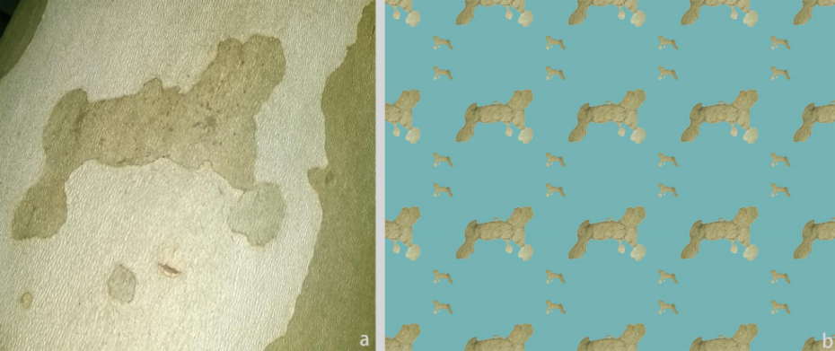 下面即为联缀式木美图案,其原始素材(a)为悬铃木树干上的宏观图像,从原始素材图像中抠取兔尾狗图形作为木美元素,采用联缀式图案创作方法进行构图,即可获得联缀式四方连续木美图案(b)。