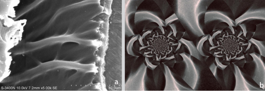 下面即为分形式木美图案,其原始素材(a)为桂花木材导管内壁螺纹加厚扫描电镜的原始图像,以此为美学素材,采用分形式图案技术进行创作,即可获得分形式木美图案(b)。
