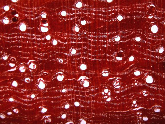 檀香紫檀相似木种介绍(一)檀香紫檀相似木种介绍(一)—— 《红木鉴》节录 1. 染料紫檀(Pterocarpus tinctorius)科属分类:蝶形花科(Papilionaceae)紫檀属(Pterocarpus) 商品名称:Red sanders, Red sandalwood 市场不规范名称:血檀 树木性状与天然分布:分布非洲的赞比亚、坦桑尼亚、安哥拉等国。 主要木材特征 心材颜色差异大,新切面为红色、黄褐色、橘红色等,久露大气中转深,与边材区别明显,边材近白色。散孔材,管孔放大镜下明显,管孔内含红色、黄色树胶,单管孔,少数径列复管孔(2~5,多为2~3个),单穿孔,管间纹孔式互列,系附物纹孔。轴向薄壁组织主要为带状(多为2~3个细胞),少数翼状及环管状。木射线非叠生;射线单列,高3~10个细胞,偶成对或2列;射线组织同形单列,少数射线细胞内含树胶。荧光反应明显。木材无明显香气。气干密度0.60~1.10g/cm3。 木材构造图